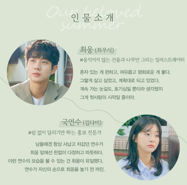 국연수 (김다미): 현실적인 삶을 살아가는 PR 전문가. 언제나 1등을 놓치지 않던 모범생이었지만, 가난한 형편 때문에 사랑과 이별에 서툴렀던 현실적인 캐릭터입니다.